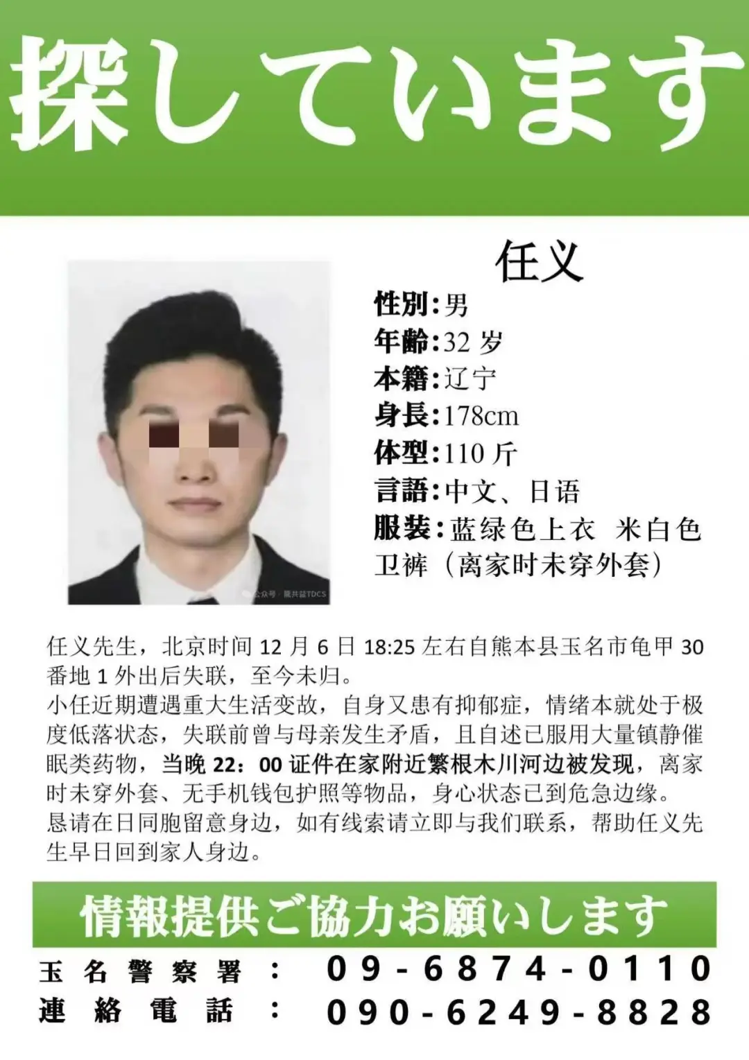 据寻人启事,任义,32岁,辽宁人。他失联时穿着蓝绿色上衣,米白色卫裤(离家时未穿外套)。失联时间为北京时间12月6日18时25分,失联地点为熊本县玉名市龟甲30番地1。任义与母亲争吵后离家,失联之前自述服用了大量的右佐匹克隆(催眠类药物)。